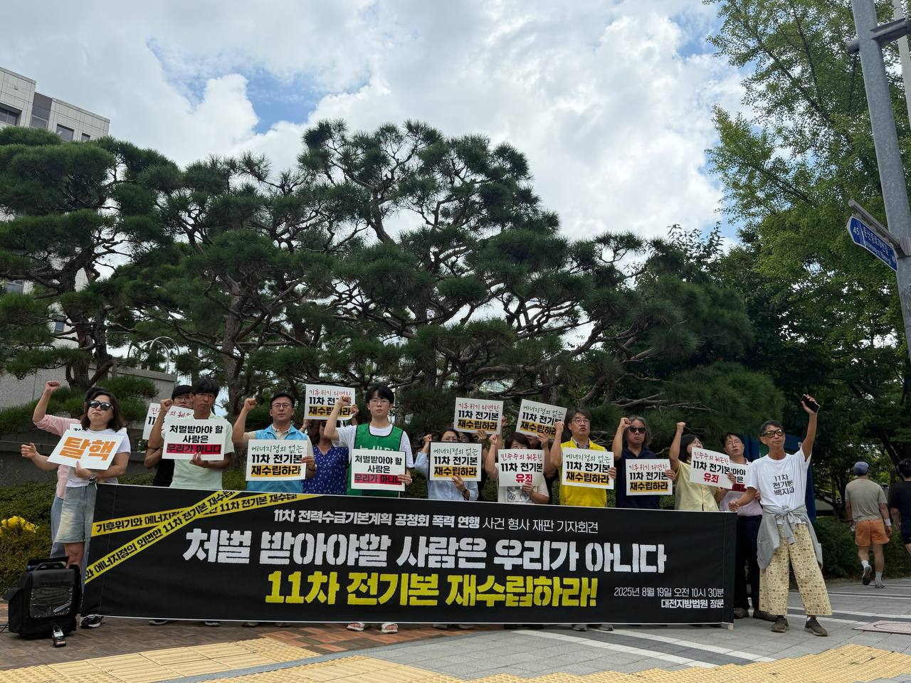 2024년 9월 26일, 세종시 정부종합청사에서 11차 전력수급기본계획(이하 11차 전기본) 공청회가 열렸다. 우리는 공청회 시작 전 단상에 올라 탈핵, 탈송전탑, 기후정의를 외쳤다. 그러나 우리의 목소리는 경찰에 의해 곧바로 진압되었고, 수갑이 채워졌다. 그렇게 전국 각지에서 모인 시민사회 활동가와 지역 주민 20명이 연행되었다. 연행된 이들 중 10명은 ‘퇴거불응’ 혐의로 검찰이 약식기소 하였고, 법원으로부터 벌금 100만 원의 약식명령을 받았다. 그러나 이에 맞서 6명의 활동가와 주민들이 정식 재판을 청구했다. 오늘은 그 사건의 첫 공판이 열리는 날이다. 1년 전 그 날처럼, 전국 곳곳에서 살아가는 이들이 다시 새벽부터 달려 대전에 모였다.