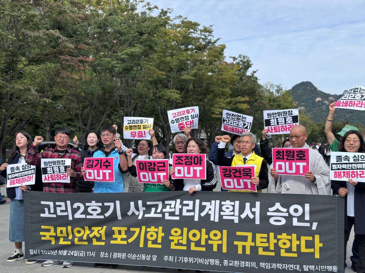 - 기자회견은 10월 23일 원안위 회의에서 고리 2호기 사고관리계획서 승인에 찬성표를 던진 최원호, 조정아, 김기수, 강건욱, 이강근 위원의 사퇴를 촉구하며, 이들의 이름을 호명하고 ‘OUT’을 외치는 퍼포먼스로 마무리되었다.