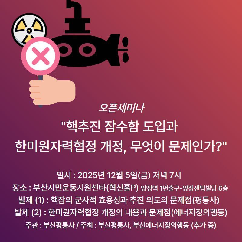 부산에너지정의행동과 부산평통사가 핵추진 잠수함 도입과 한미원자력협정 개정에 관한 오픈 세미나를 진행합니다. 최근 한미 정상회담에서 미국이 한국의 핵잠수함 건조와 사용후핵연료 재처리 권한 확대에 대한 지지한다는 입장이 담겨 있었습니다. 이것에 대한 내용과 쟁점, 과제에 대한 이야기를 나눕니다. 많은 관심과 참석을 부탁드립니다.